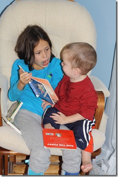 Meanwhile…D and C could be found playing in the other room! Sometimes they participate, but after painting their huts, D was done this time!